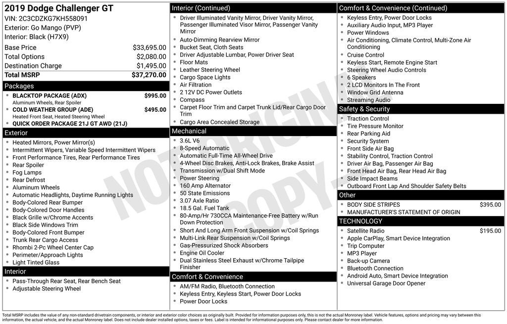 2019 Dodge Challenger GT AWD ***Heated Steering Wheel***, ***Heated Front Seats***, ***Rear View Camera***, ***Parking Sensors***, ***Bluetooth®***, ***Sirius XM Radio***, ***Apple Carplay/ Android Auto***, ***Remote Start***, ***Houndstooth Cloth Performance Seat ***.