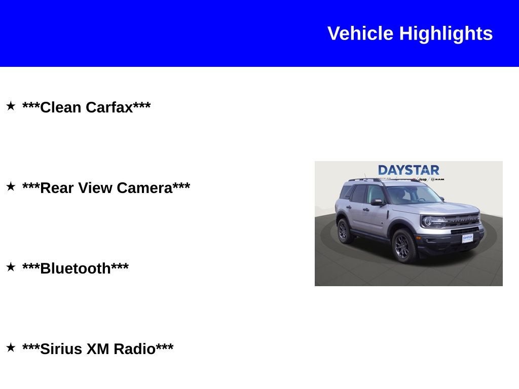 2021 Ford Bronco Sport Big Bend 4WD Odometer is 17544 miles below market average! ***Clean Carfax***, ***Rear View Camera***, ***Bluetooth®***, ***Sirius XM Radio***.